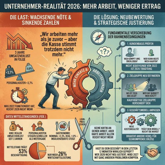 Drei Jahre Umsatzverlust in Folge. Personalkosten +3,7%. Erlöse -0,9%. Wenn ich mit Unternehmern spreche, höre ich immer öfter denselben Satz: „Wir arbeiten mehr als je zuvor – aber am Ende des Tages stimmt die Kasse trotzdem nicht mehr." Der DATEV Mittelstandsindex von Februar bestätigt, was viele längst spüren: → KMU verlieren seit 3 Jahren real